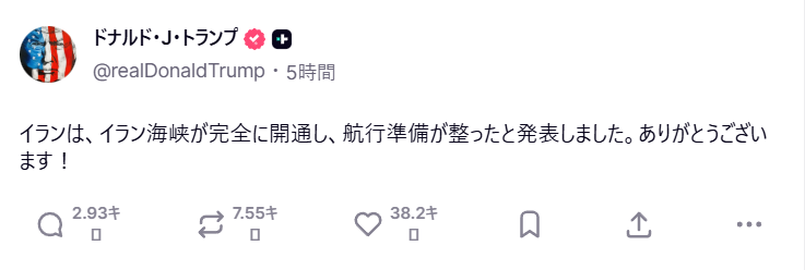 日本時間17日の21頃、アメリカのトランプ大統領は自身のSNSに、イランはホルムズ海峡が「完全に開放され、全ての船舶の航行が可能な状態になったと発表した」と投稿。