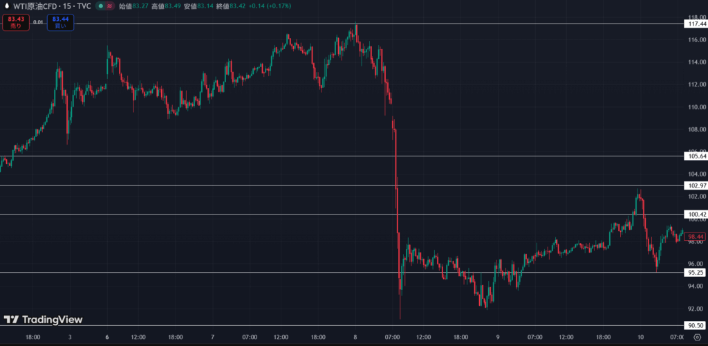 アメリカとイランが2週間の停戦で合意したとの報道を受け、1バレル=117ドル台まで上昇していた価格が、一時91ドル台まで急落。