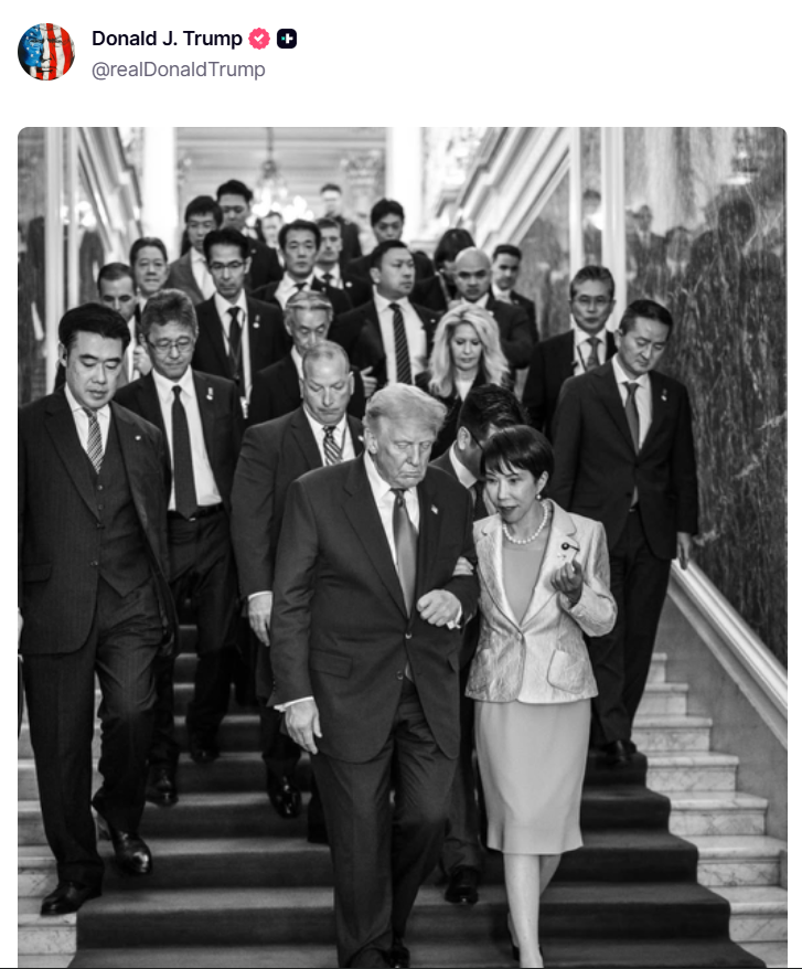 トランプと高市首相が腕を組み、階段を降りている写真。まるで映画のワンシーンみたいですよね。